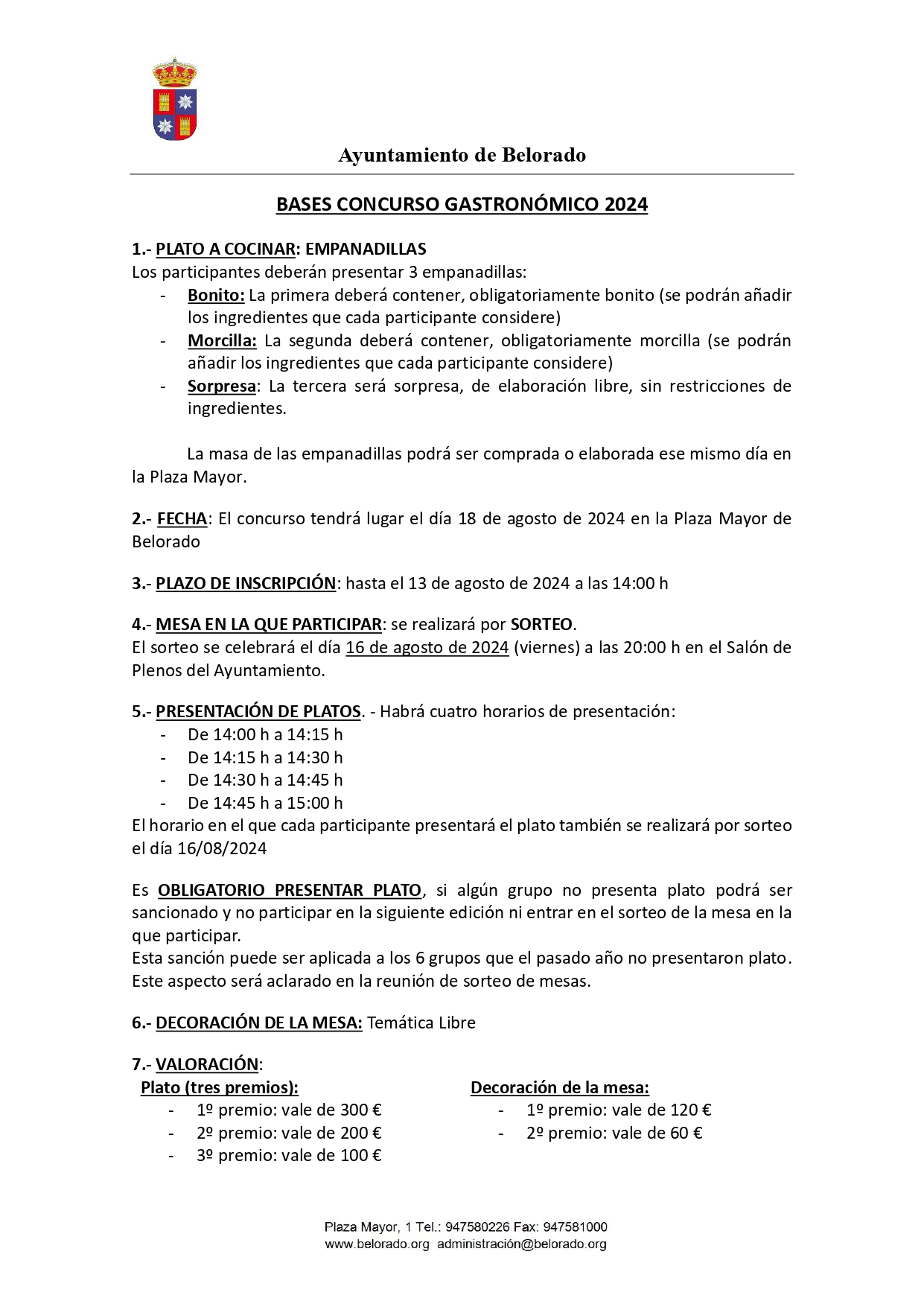 Concurso gastronómico 18/08/2024 Concurso gastronómico Inscripciones en Oficina Municipales hasta el 13 de agosto Reunión sorteo de mesas el 16 de agosto a las 20h. en el Salón de Plenos del Ayuntamiento Plato a cocinar: empanadillas