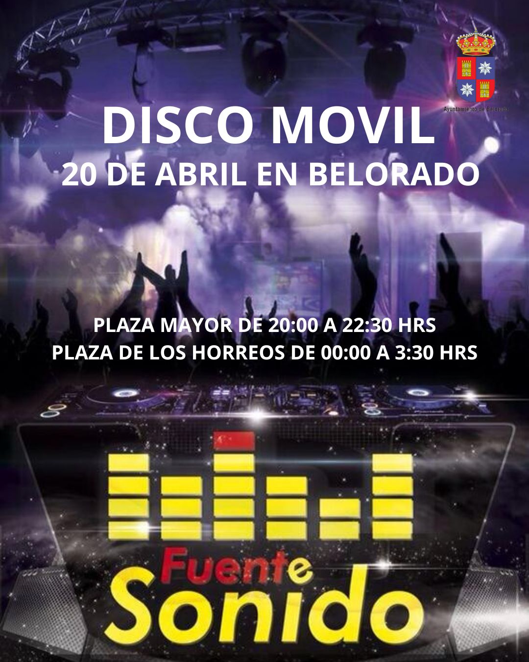 DISCO MOVIL 20/04/2024 Comentario sobre el horario Plaza Mayor de 20:00 a 22:30 Plaza de los Horreos de 00:00 a 3:30 DISCO MOVIL: FUENTE SONIDO