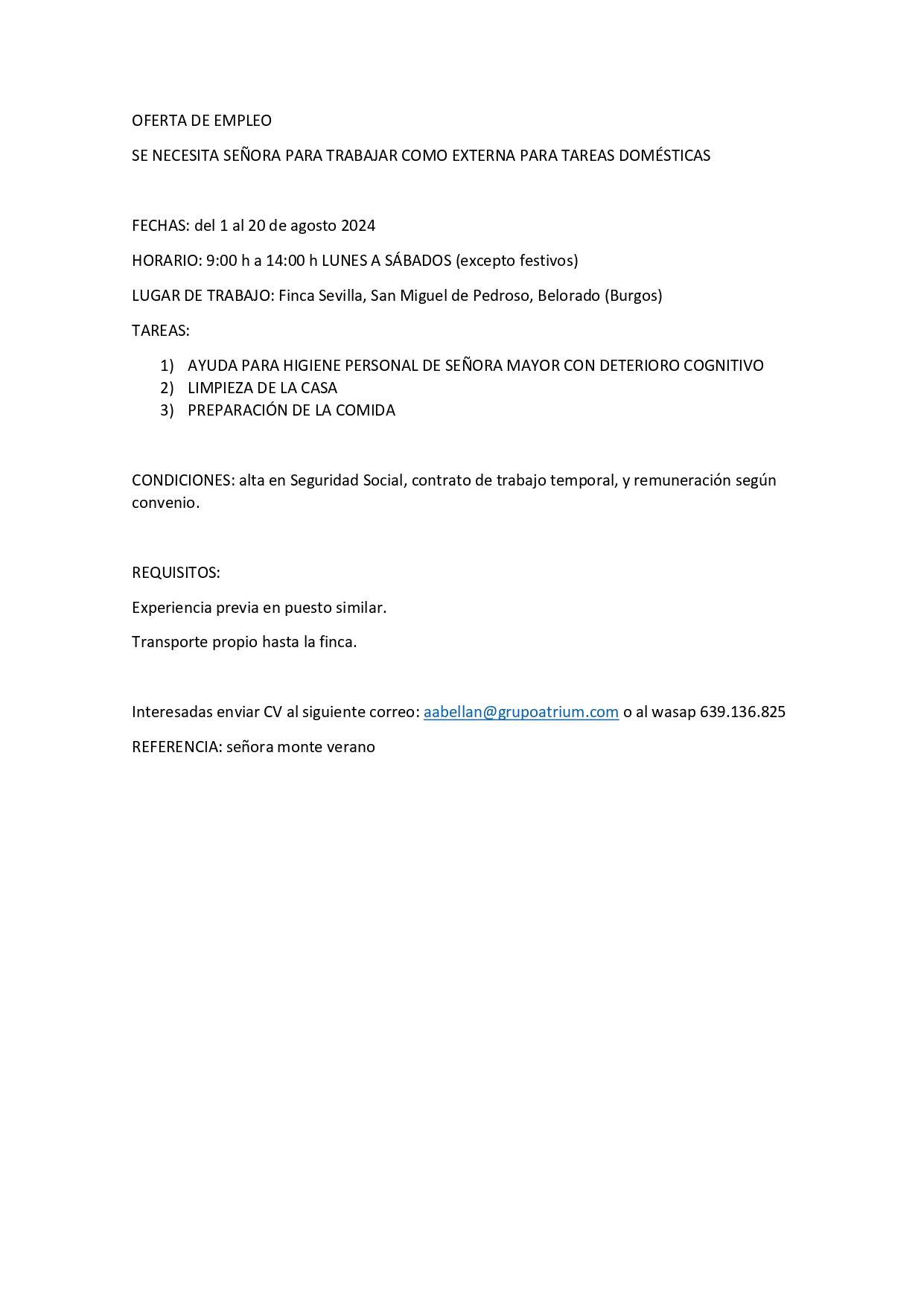 Oferta de empleo - Interna fines de semana 2024-07-11 Leer más Oferta de empleo - cocinera 2024-07-11 Leer más Bando Ayuntamiento de Belorado 2024-07-05 Leer más OFERTA EMPLEO - OPERADOR/A DE PLANTA EN MINERA SANTA MARTA 2024-07-04 Leer más IX Circuito burgalés de ajedrez 2024-07-03 Leer más Oferta empleo - tareas domesticas - finca Sevilla 2024-07-03 Leer más SESIÓN ACADÉMICA DE CLAUSURA DEL CURSO 2023-2024 2024-07-06 Leer más Ayuntamiento de Belorado 2024-06-27 Leer más BANDO CONTRATACION MONITOR PARA LA ESCUELA DE VERANO 2024-06-21 Leer más Campamento de Verano 2024 2024-06-19 Leer más