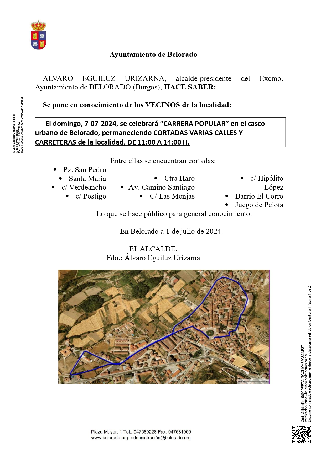BANDO Ayuntamiento de #Belorado El domingo, 7-07-2024, se celebrará “CARRERA POPULAR” en el casco urbano de Belorado, permaneciendo CORTADAS VARIAS CALLES Y CARRETERAS de la localidad de 11:00 a 14:00 hrs